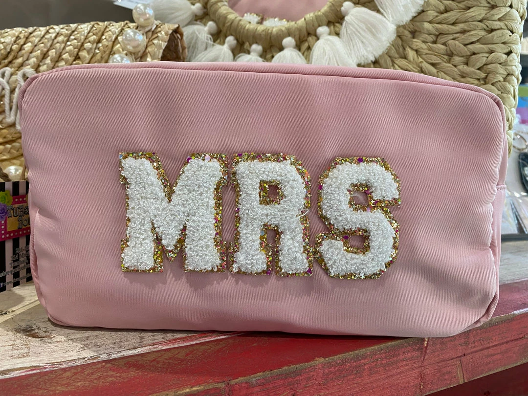 Cutest make up bag ever! Chenille letters spelling MRS in a soft pink. This bag is 10″ x 5″ and has a zipper top.