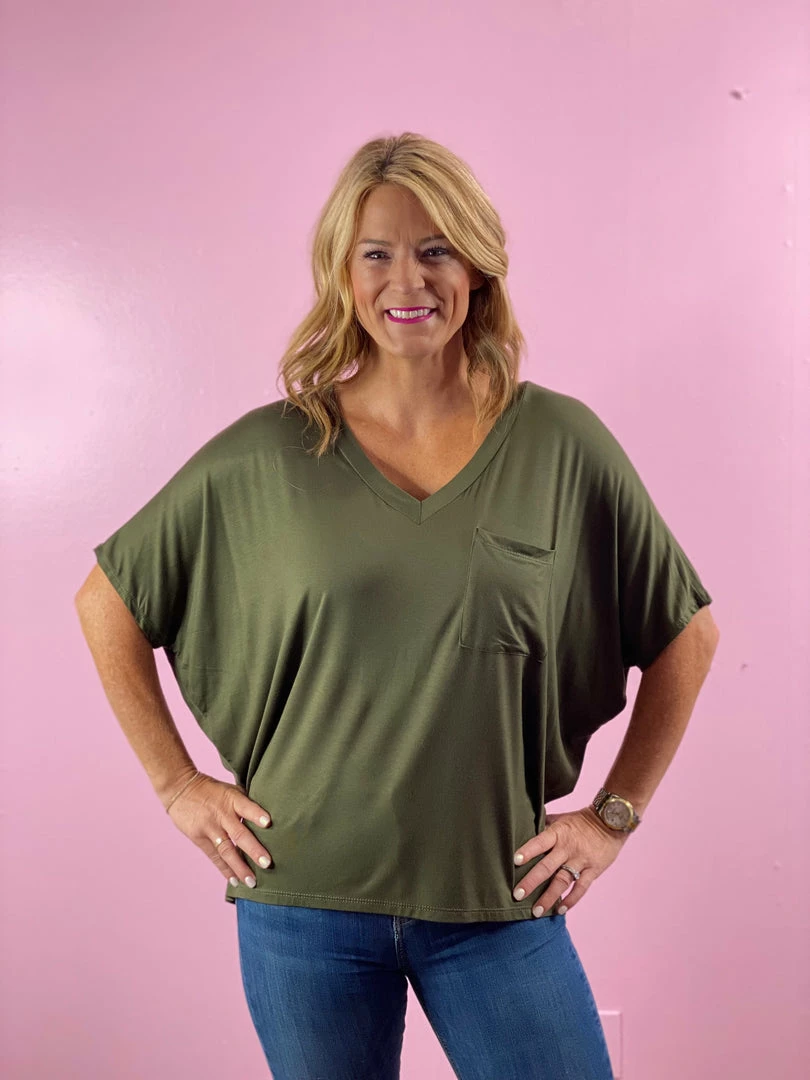 Need a good staple top that’s easy to dress up or down? The Adrienne Top is it! This short sleeve top is buttery soft and oversized. Featuring a v-neck and a single pocket on the front. This literally could go with anything. Daytime or nightime, and it’s flattering for all.