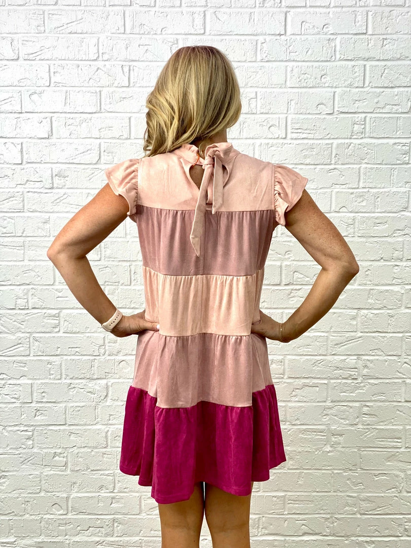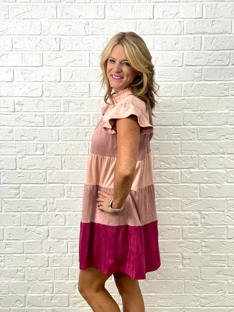 Looking for a cute and comfortable dress that you can wear on any day? Look no further than the Allison Suede Dress! This adorable dress features ruffle cap sleeves, a tie closure at the neck, and color blocking in nude, pink, and magenta. The loose fit makes this dress flattering for everyone, and the soft suede fabric is sure to keep you comfortable all day long. Whether you’re running errands or meeting friends for lunch, the Allison Suede Dress is the perfect choice!