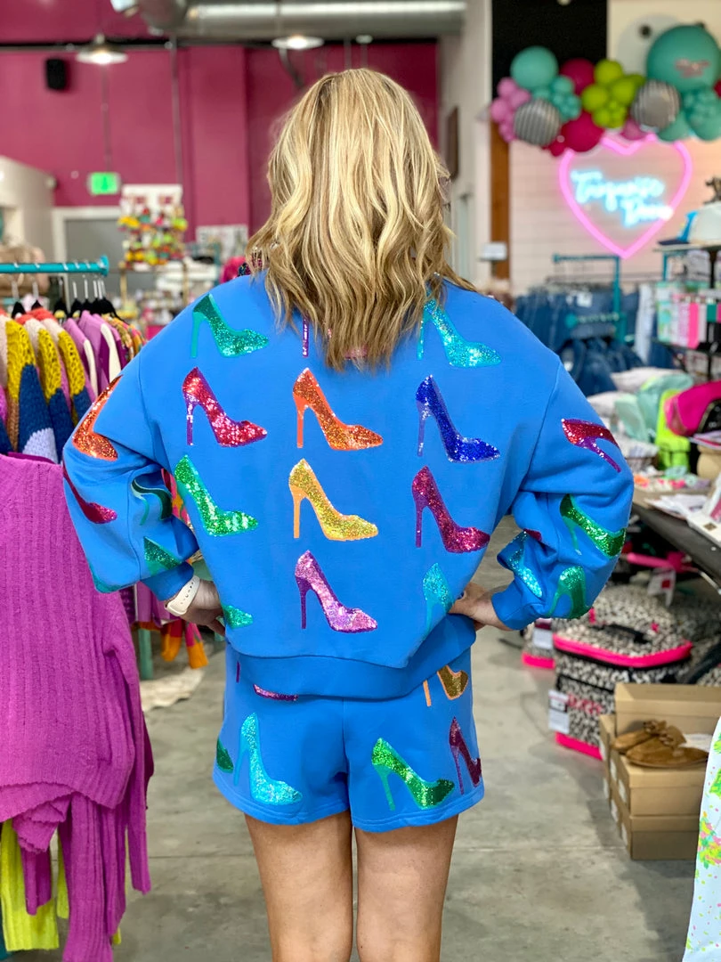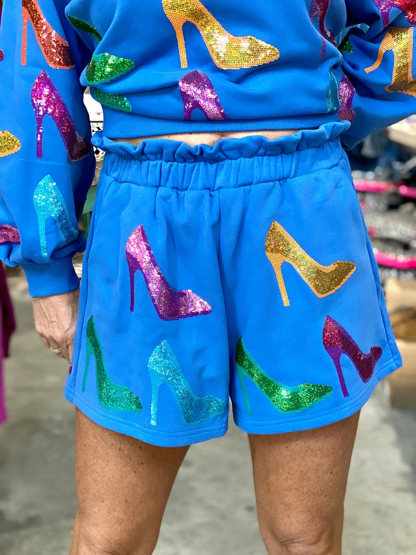 Calling all fashionistas! This new Queen of Sparkles Indigo Stiletto Short is so sassy and fun.ย A pretty blue sets the background for the sequined high heels scattered all over these shorts.ย Each high heel is featured in a different a color, and in true Queen fashion they’re super sparkle out shines it all.ย These shorts have an elastic waistband for a comfy fit and also have a matching sweatshirt.ย ย ย