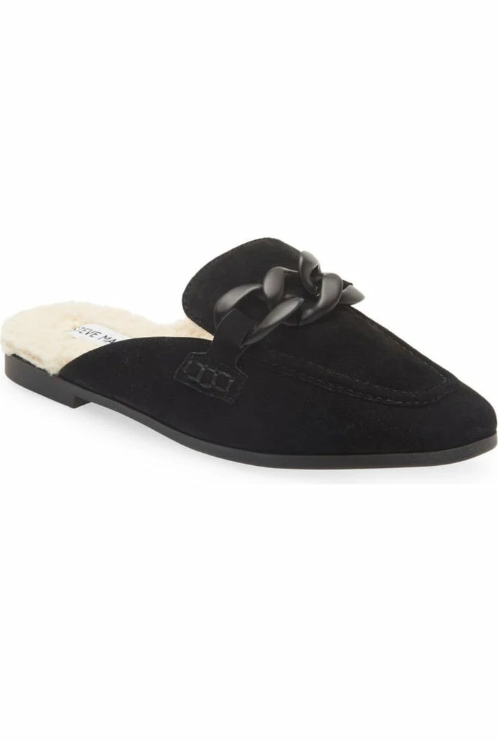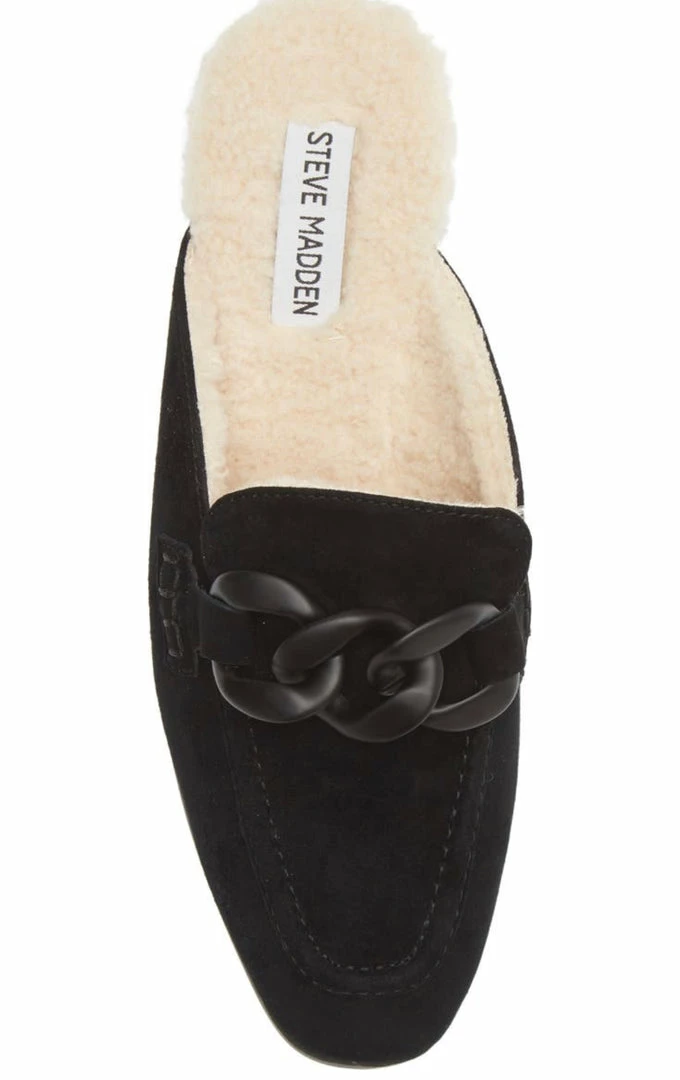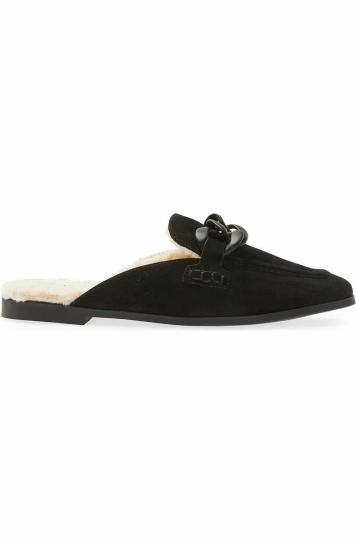 Slip into comfort with this cozy faux shearlingβlined mule shaped from supple suede and topped with a chunky chain strap for even more texture.