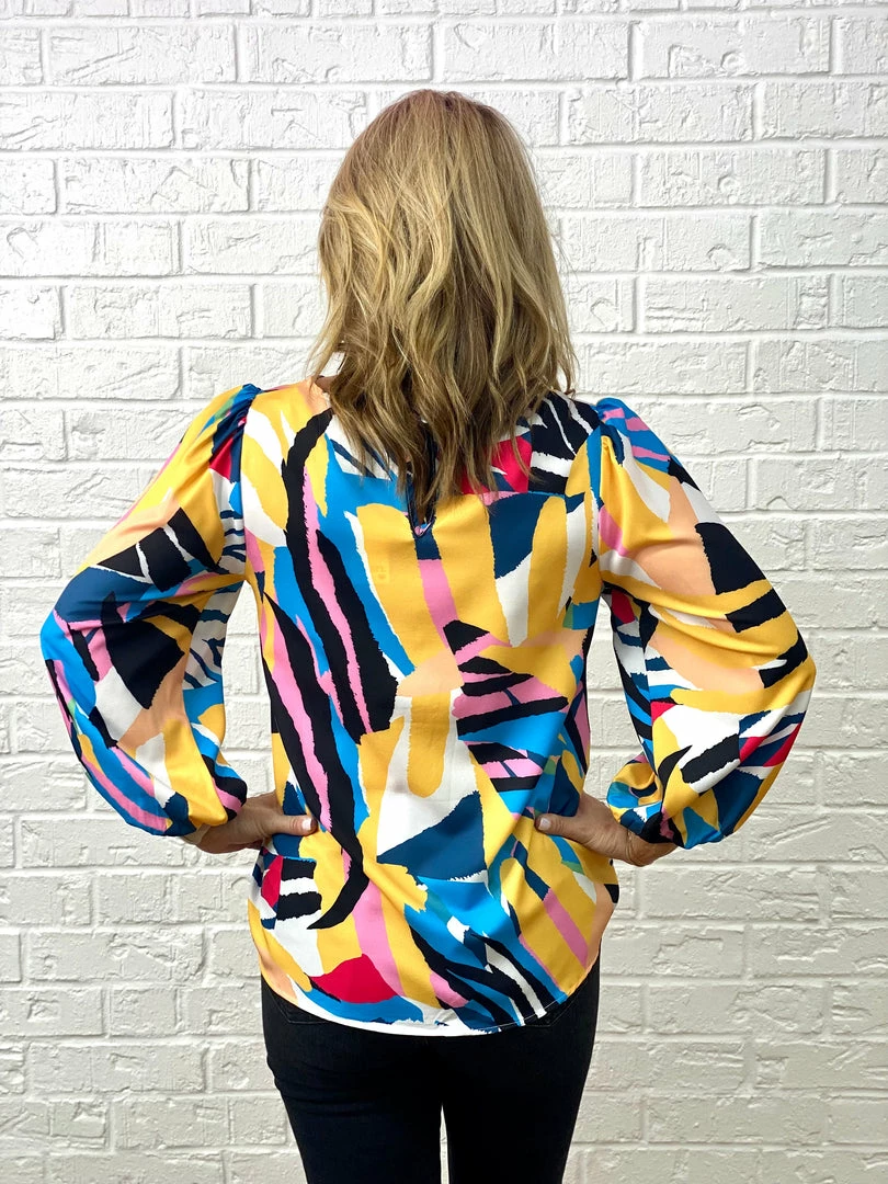 The Celeste Top is a beautiful blouse with an abstract print that is perfect for standing out from the crowd. The scoop neck and relaxed fit with small elastic gathering at the end of the sleeves create a flattering silhouette, while the pops of color add a touch of fun and personality. Whether you’re dressing up for a special occasion or just looking to add a little flair to your everyday style, the Celeste Top is a great choice.