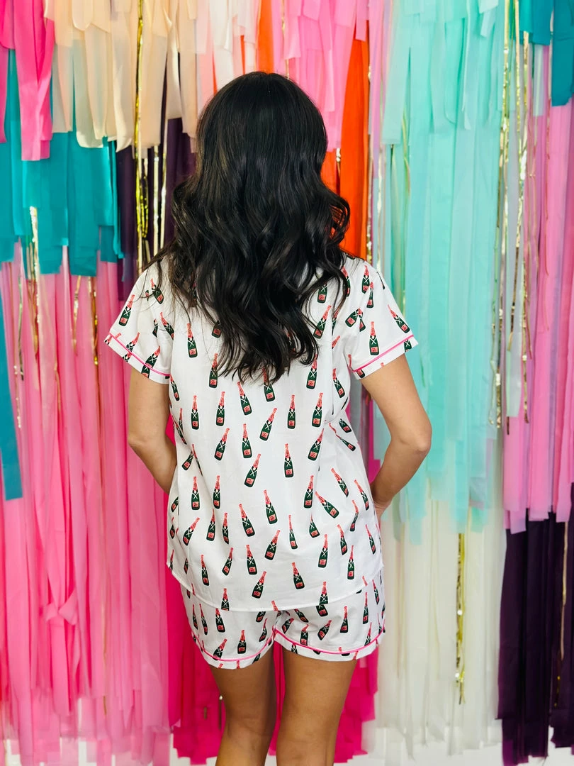Fizz the Season for pajamas! This set features a pink and green champagne bottle print with pink trim. An elastic waistband on the bottoms for a comfy fit and button down top with single pocket on the front chest. These make a perfect gift for a loved one or yourself!