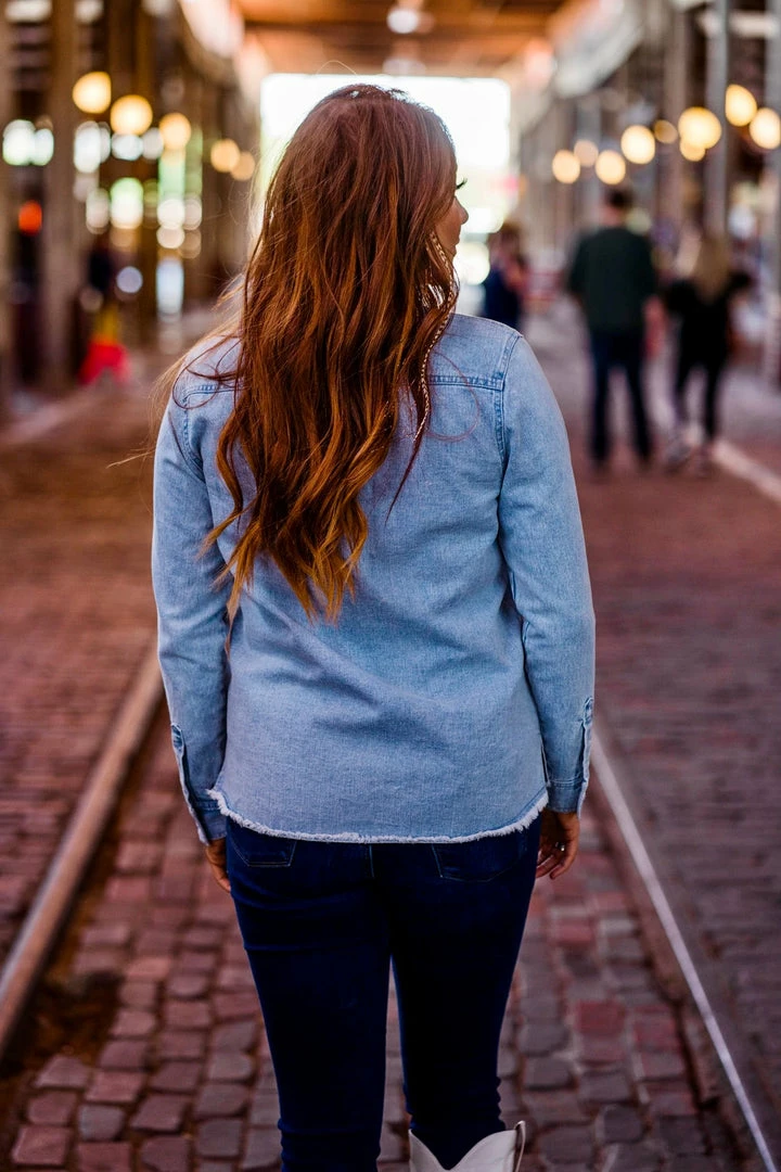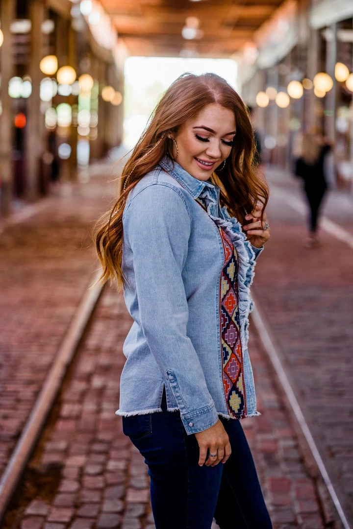 Denim is always in style and this Clyde Top proves it with a timeless denim look. The collared neckline and long sleeves with pearl snap closures give it a classic feel, while the frayed ruffle down the front and at the bottom add a touch of whimsy. The multi colored southwest print down the front gives it just a hint of western flair. Whether you’re running errands or meeting up with friends, this top is sure to keep you looking cute and feeling comfortable all day long.