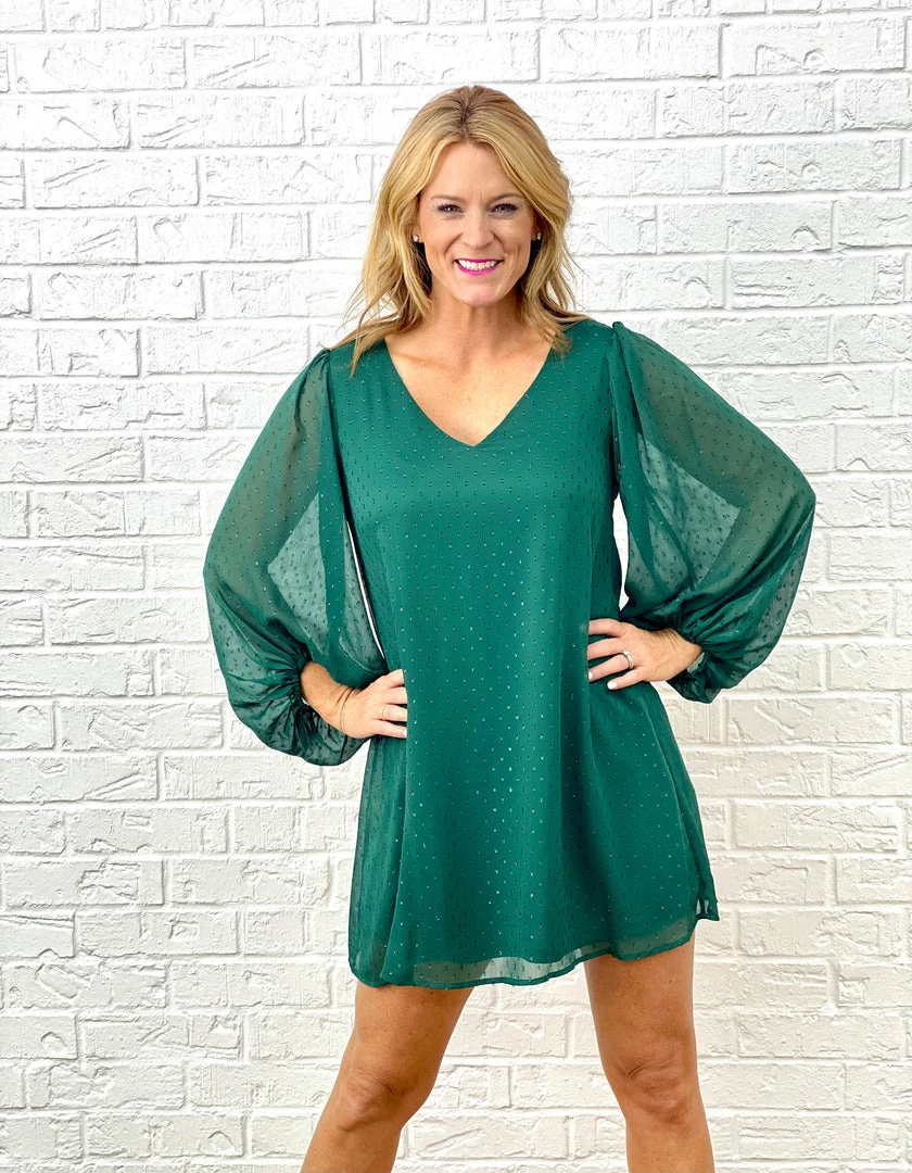 All the glitz and glam with this Emerald Glitzy Dress! A solid deep emerald green with sparkle sticthing detail through out. A v-neck and sheer balloon puff long sleeves with small elastic at the cuffs. A flowy fit flattering all body types and fully lined. A perfect dress for a date night or any specail occasion.