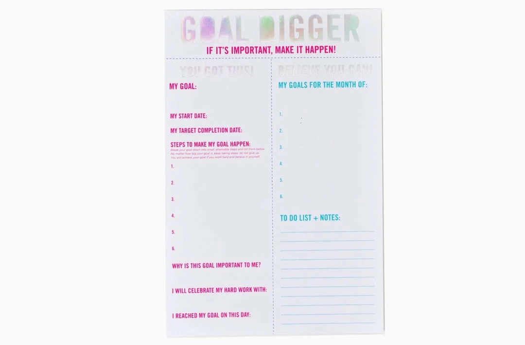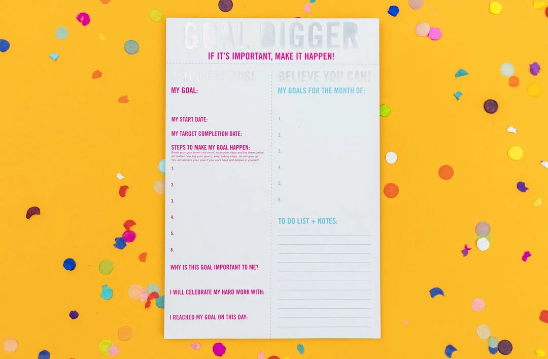 Set big goals and achieve them with our Goal Setting Notepad. On the left hand column of this notepad, take your goal and break it down into attainable, baby steps. The perforated lines allow you to tear your list off. Use the stickers (!!!) included with this notepad to hang it somewhere as a reminder of why you’re doing this. The right column is bigger picture monthly goals. Did we mention these come with stickers?!?!