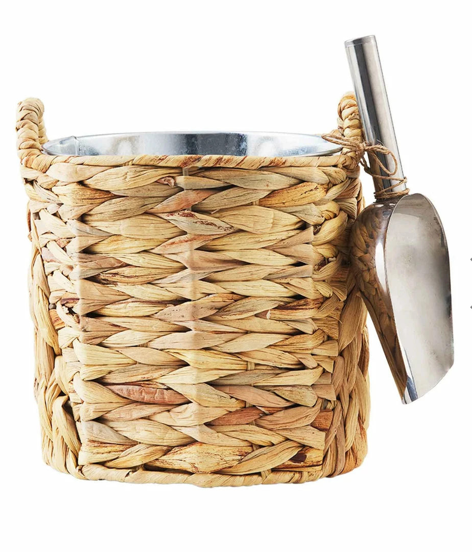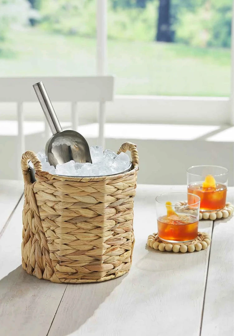 Have fun mixing medias with our Hyacinth Ice Bucket Set. The three piece set comes with a tin ice bucket. The ice bucket fits perfectly in on water hyacinth basket sleeve. The set also comes with a stainless steel ice scoop. This is made for backyard gatherings and summer soirees.