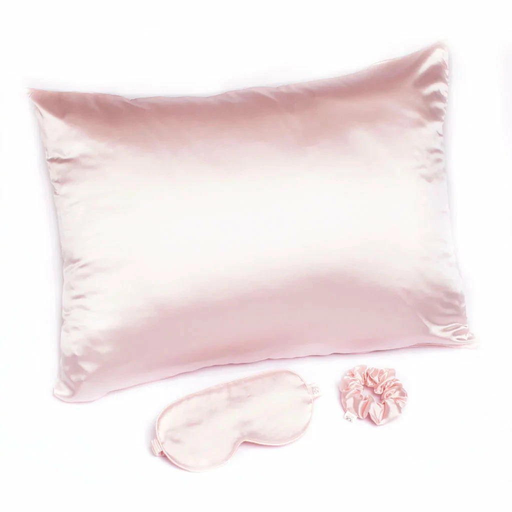 Say goodbye to unwanted wrinkles, puffy eyes and dark circles and hello to this ultimate slumber set in satin! Includes 1 standard pillowcase (26 x 20), 1 sleep mask + 1 scrunchie. We make beauty sleep a breeze with our silky satin pillowcase and scrunchie that wonโt pull, crease or damage skin and hair. Luxuriously soft sleep mask with adjustable strap allows for extra shut eye when you need it most. Adorable packaging makes it an easy gifting choice or party favor!