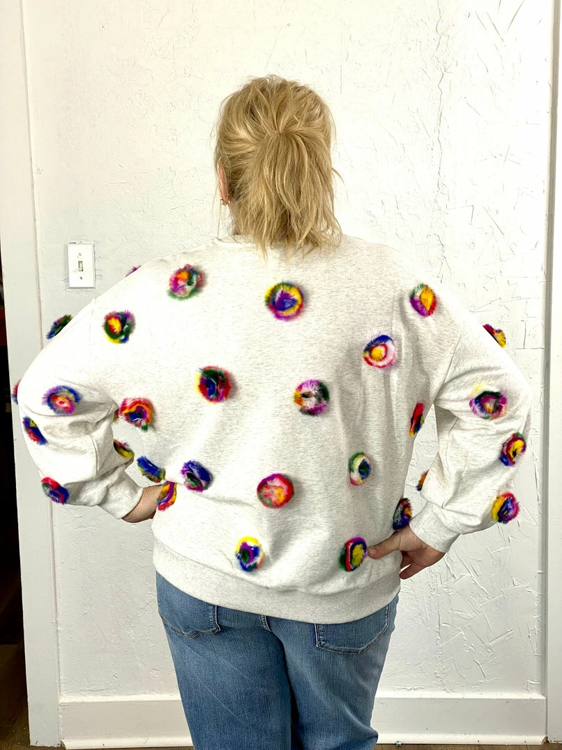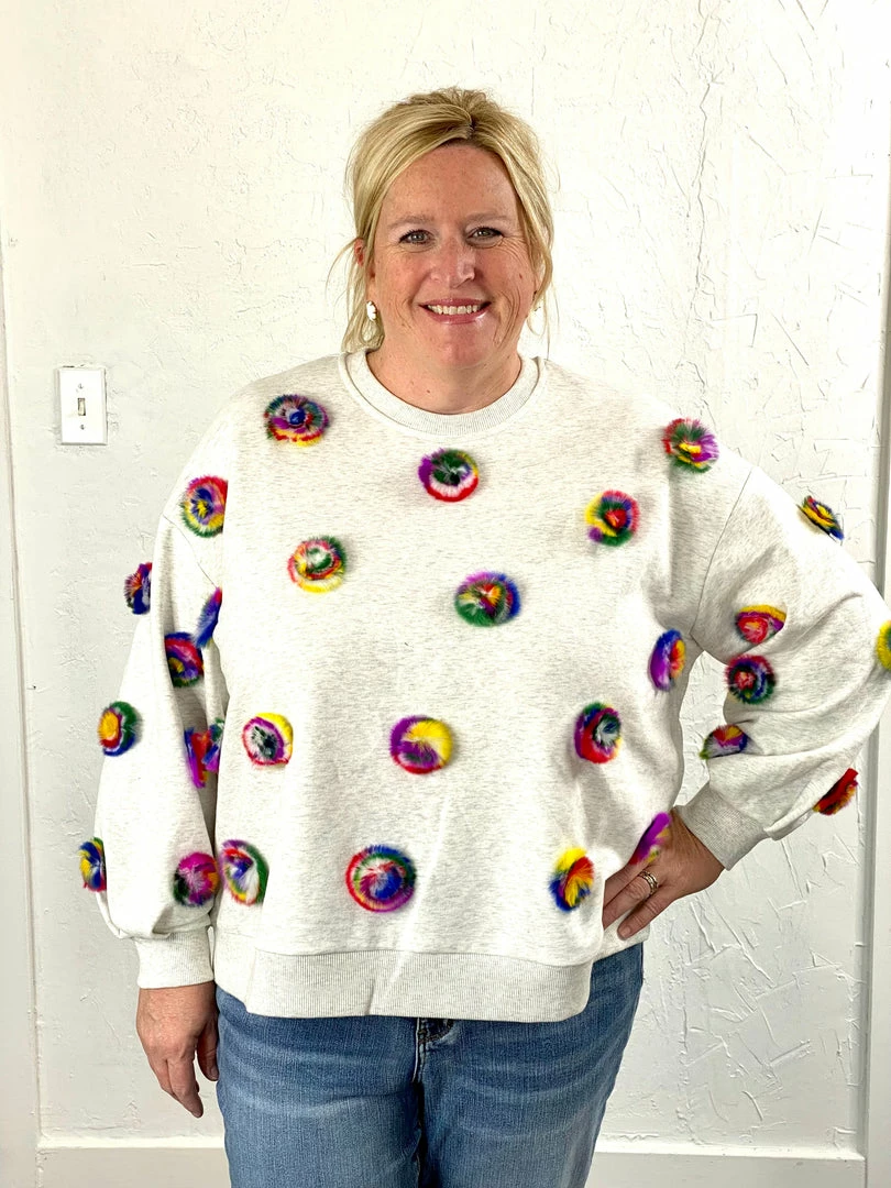 Step aside boring sweatshirts, this Queen of Sparkles Grey Pom Pom Sweatshirt is a step above the rest!ย A heather grey colored background with multi colored soft furry pom poms scattered all over.ย This fun and one of kind top is oh so soft for ulimate comfort.