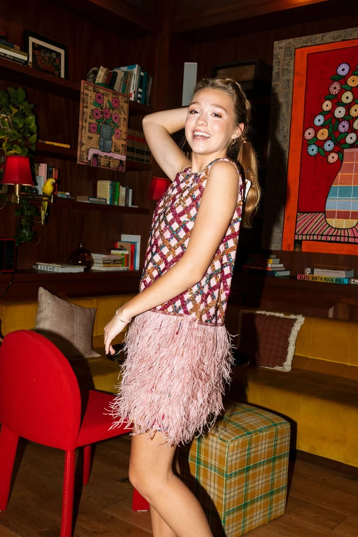 Get ready for the ultimate razzle dazzle! Queen of Sparkles has captivated us with this new Light Pink Diamond Feather Dress. Juicy jewel toned sequins criss-crossing over each other with that light pink peeping through. A fabulous feathered section at the bottom gives a modern flapper vibe. A sleeveless, shiny, sparkly, show stopper! The party won’t start till you walk in with this on.