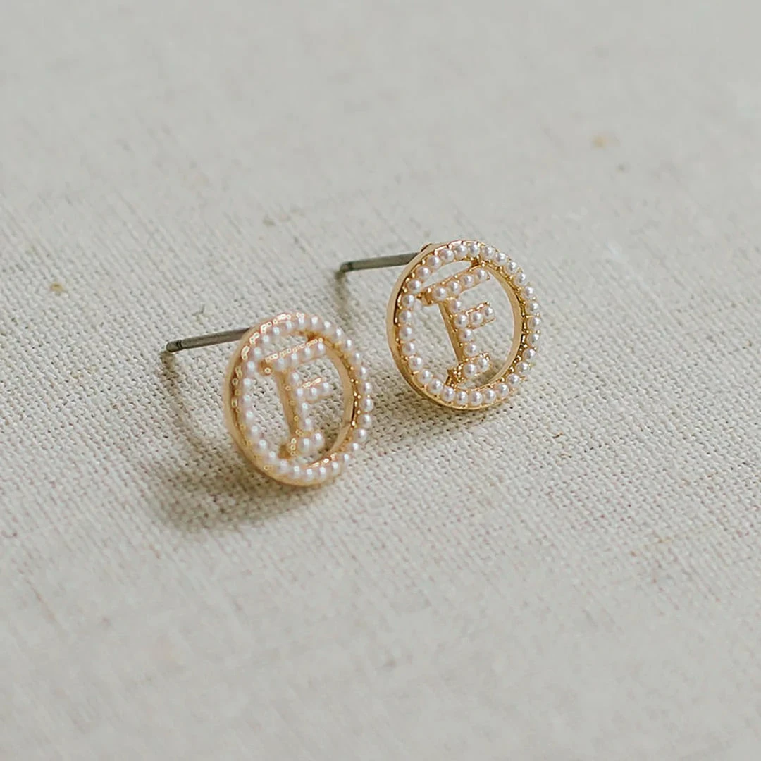 - Round pearl inlay initial stud earrings