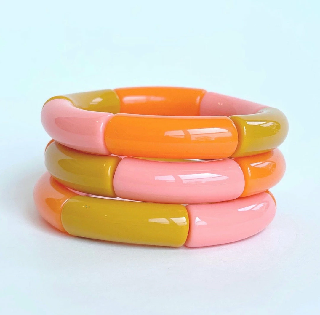 Orange Beach acrylic bangles combine all the beautiful orange and peach colors you’d see in a beach sunset! This sunny beaded stack will bring you a taste of sunshine all year long! Orange Beach is a combination of our bright orange, peach, and marigold tube beads. These look adorable as a stack or mixed with solid colors in your stack!