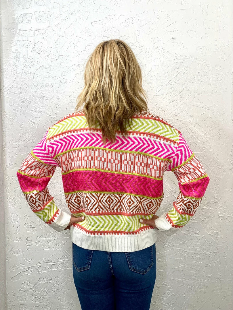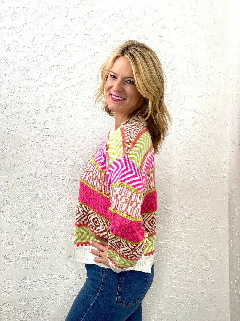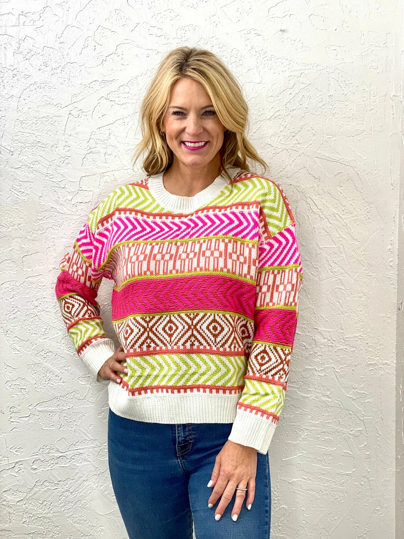 Looking to add some fun print to your closet?ย The Shayne Sweater is just the piece to do it!ย This cozy oversized knit sweater has mixed pattern stripes horizontally across in shades of pink, mauve, green and white.ย This top would pair well with jeans and cute booties or sneakers.ย So push those same old boring sweaters to the side and grab this one today!
