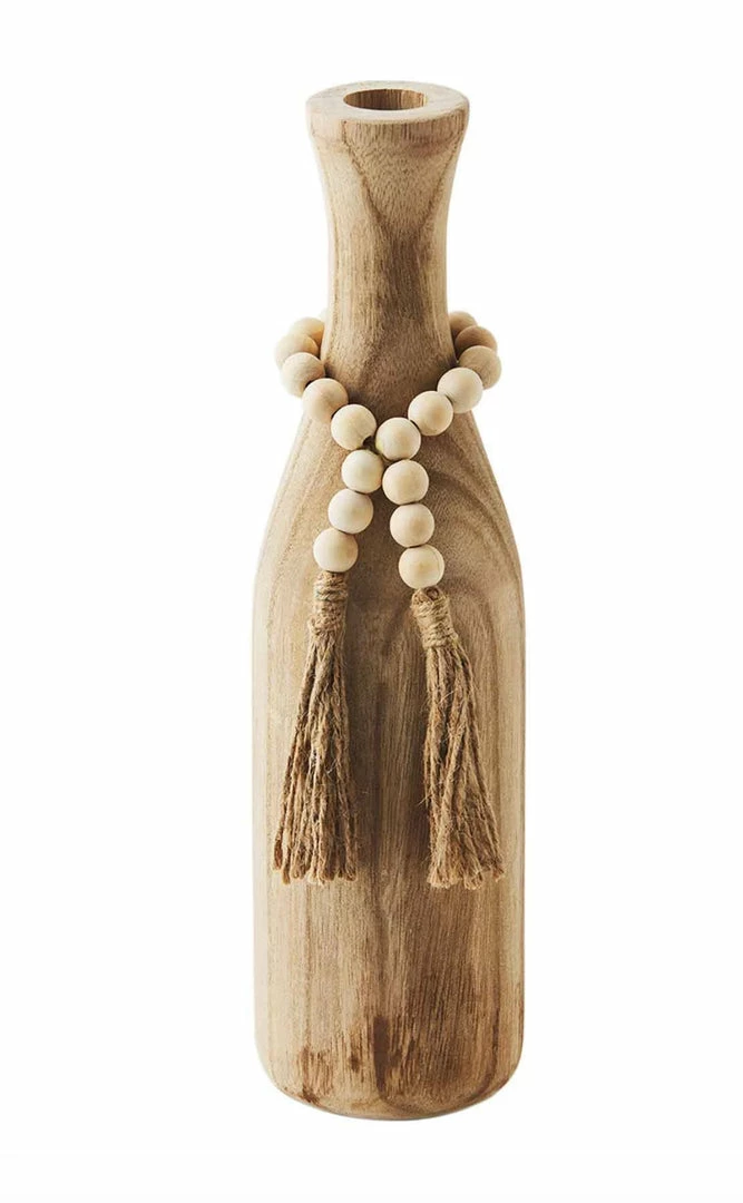 Enhance your space with our Tassel Paulownia Beaded Vase. The small paulownia wood vase features accent beads. The beads feature a charm and tassel details. The vase will feature a distressed finish and unique markings. The vase is perfect for faux florals and greenery.
