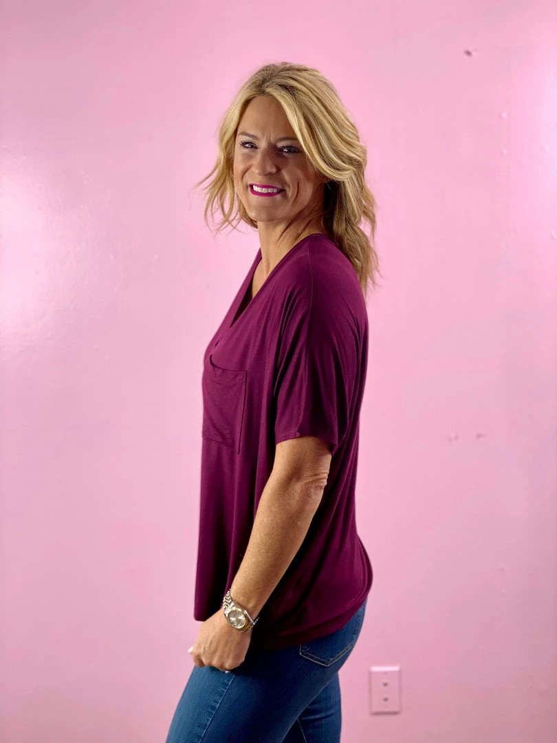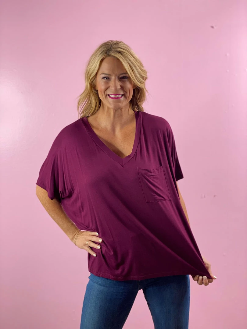 Need a good staple top that’s easy to dress up or down?ย The Adrienne Top is it!ย This short sleeve top is buttery soft and oversized.ย Featuring a v-neck and a single pocket on the front.ย This literally could go with anything.ย Daytime or nightime, and it’s flattering for all.ย ย
