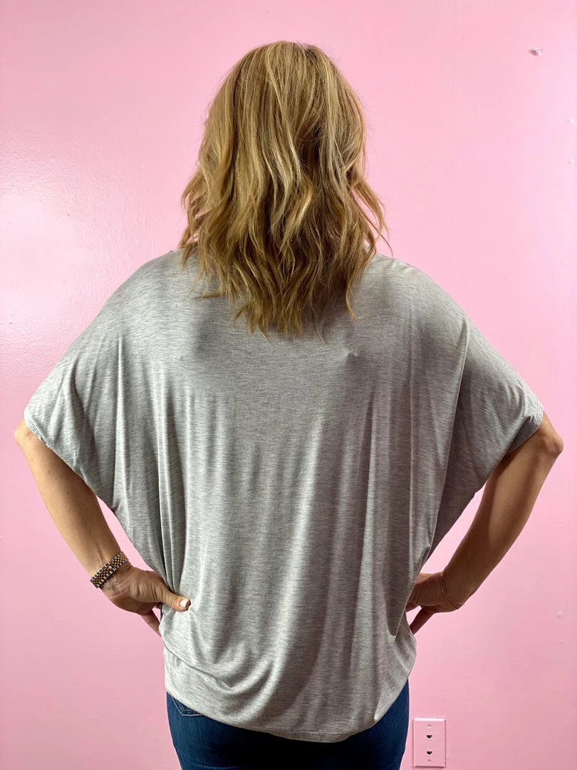 Need a good staple top that’s easy to dress up or down? The Adrienne Top is it! This short sleeve top is buttery soft and oversized. Featuring a v-neck and a single pocket on the front. This literally could go with anything. Daytime or nightime, and it’s flattering for all.