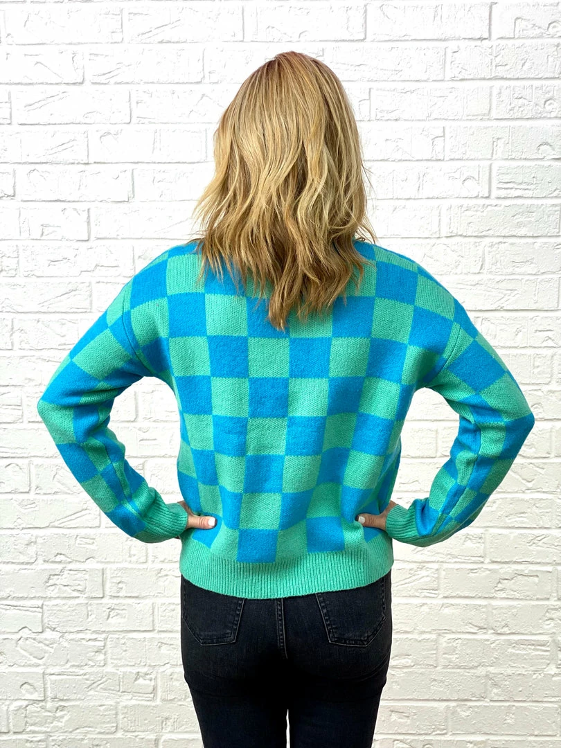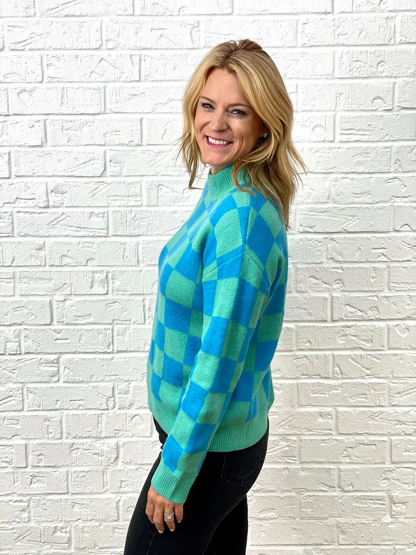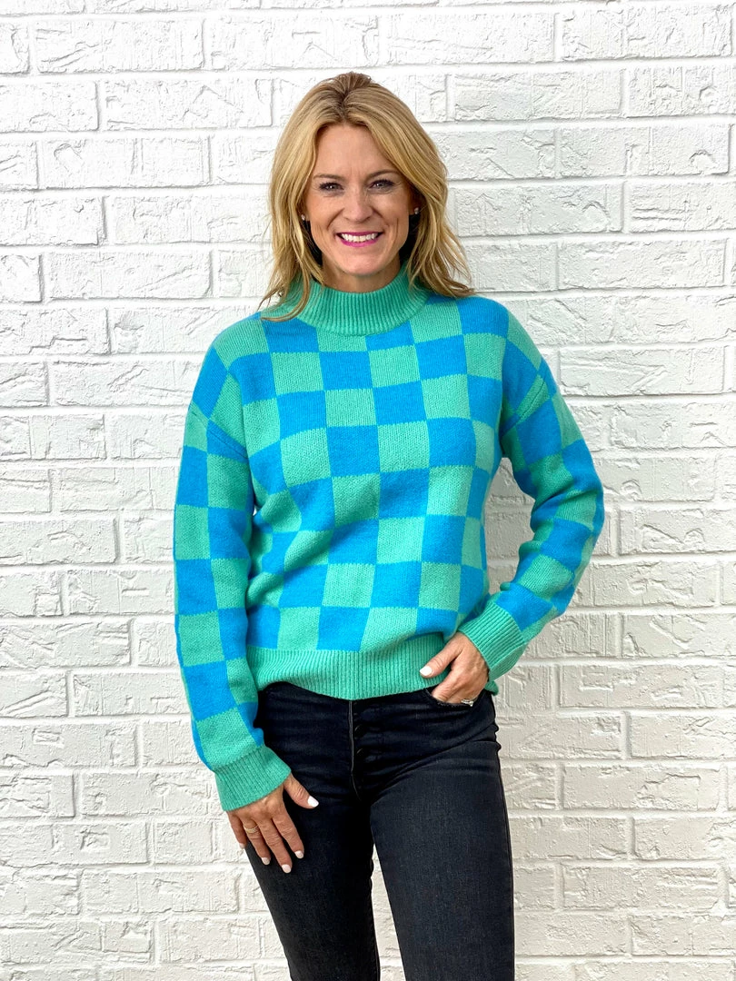 The Andy Check Sweater is the perfect piece to add a pop of personality to your everyday look. With its fun turquoise and blue checkered print, this mock turtleneck sweater is sure to stand out from the rest. The soft, slightly relaxed fit will keep you comfortable all day long, while the cute and fun style will make it a go-to in your wardrobe. Whether you’re running errands or meeting up with friends, the Andy Check Sweater is sure to add a touch of fun to your look.