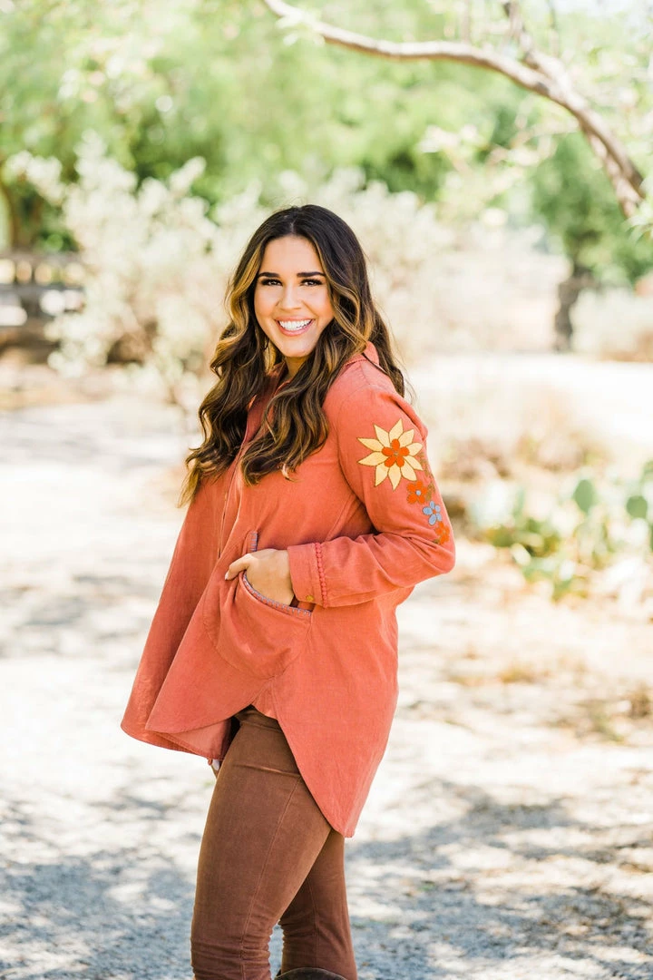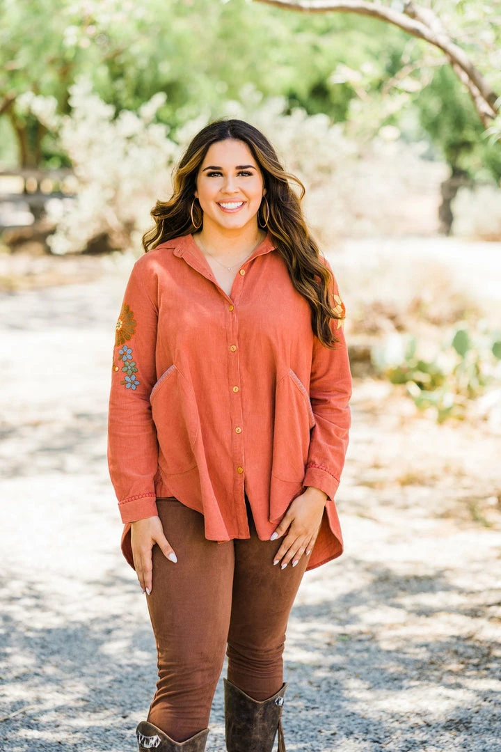 The Priscilla Top is the look of fall.ย A rust colored corduroy button down top with blue stitching detail on the two front pockets and embroidered flowers on the sides of the sleeves.ย Perfect for a nice autumn day running errands or lunch with friends.ย ย